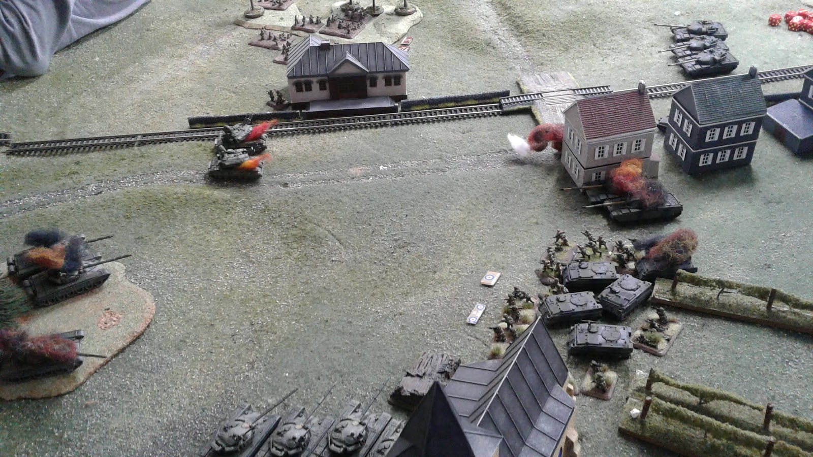 | By the end of the game it looked like a parking lot was on fire. My Jaguars and infantry in the buildings secured the win. |